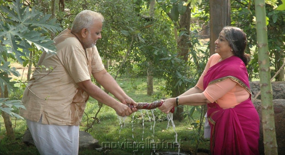Appadasu and Buchchi are sheer poetry together. The image of ardhanaareeshwara, where the wife completes the husband is befitting in this context. One cannot imagine a discourse without either of them absent in the frame. Even in the absence of dialogues, we see a rare but compelling chemistry between Appadasu and Buchchi (of course, the actors - SPB-gaaru and Lakshmi-gaaru - have brilliantly performed). This elderly couple is not quiet, that is, they ensure to keep one another engaged day after day. If Buchchi indulges in cooking varieties of food, Appadasu engages in minor labours, such as pottery making, gardening, attending to the cattle, and so on. We see independent individuals who also need each other to depend on. It is quite a tautology one would think, but the truth is simple - communication of all sorts make a relationship work. We do not see a couple who “adjust” with each other; instead, we see a couple who have embraced each other as they are with their flaws and quirks.